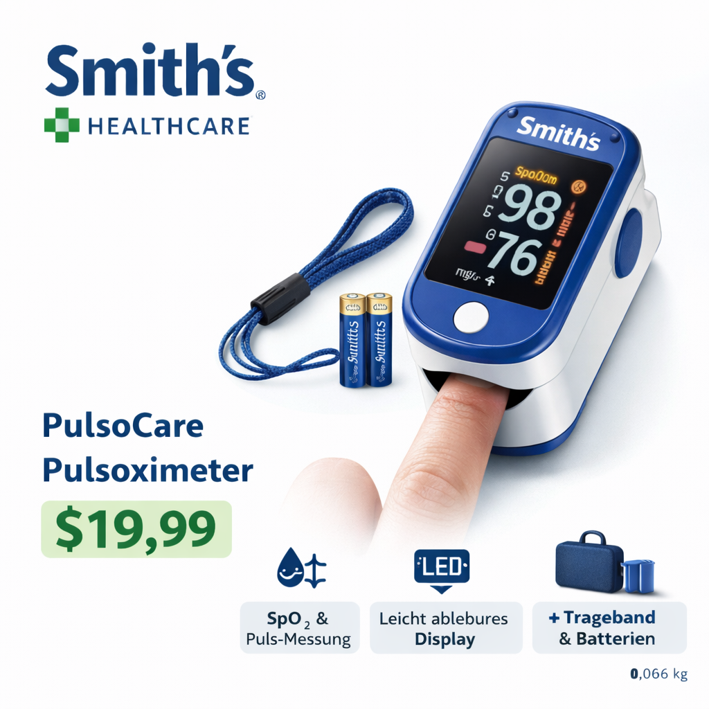 Das Smith’s Healthcare PulseCare Pulsoximeter misst schnell und zuverlässig die Sauerstoffsättigung im Blut (SpO₂) sowie den Puls. Das kompakte Gerät wird einfach auf den Finger gesteckt und liefert innerhalb weniger Sekunden genaue Messergebnisse auf dem klar ablesbaren Display.